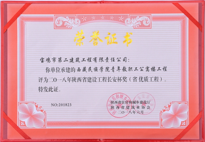 長安杯獎(jiǎng)是陜西省住房和城鄉(xiāng)建設(shè)廳評(píng)選、頒發(fā)的本省建設(shè)工程質(zhì)量最高榮譽(yù)獎(jiǎng)。西藏民族學(xué)院青年職工公寓樓工程是西藏民族學(xué)院(現(xiàn)更名西藏民族大學(xué))確定的重點(diǎn)建設(shè)工程項(xiàng)目,也是公司推行內(nèi)部模擬股份制架構(gòu)下精細(xì)化管理模式試點(diǎn)項(xiàng)目。在建設(shè)初期,公司總部精心策劃,全力部署,公司領(lǐng)導(dǎo)多次蒞臨施工現(xiàn)場檢查指導(dǎo)工作。公司副總經(jīng)理兼項(xiàng)目經(jīng)理曾永祥精心組織,細(xì)化分工,責(zé)任到人,嚴(yán)格要求項(xiàng)目部全體管理人員,并堅(jiān)持以身作則,帶領(lǐng)整個(gè)團(tuán)隊(duì),戰(zhàn)高溫、抗嚴(yán)寒、抓質(zhì)量、搶進(jìn)度,最終完成了這項(xiàng)經(jīng)得起各方檢驗(yàn)的優(yōu)質(zhì)工程,為業(yè)主和社會(huì)交上了一份滿意的答卷。