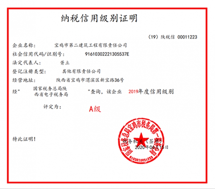 近日,從陜西省稅務(wù)局傳來喜訊,公司榮獲陜西省2019年度“納稅信用A級納稅人”榮譽稱號。
